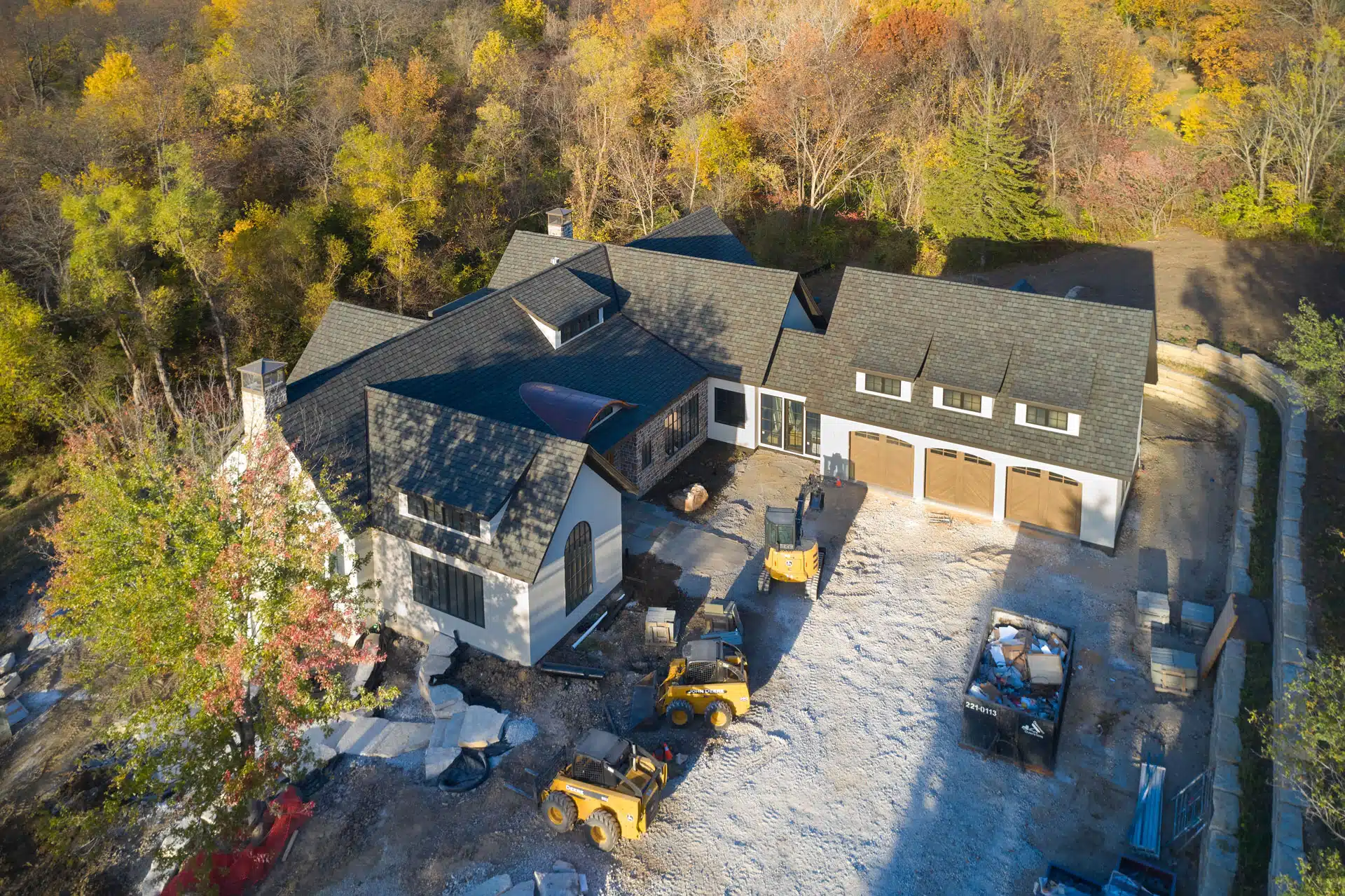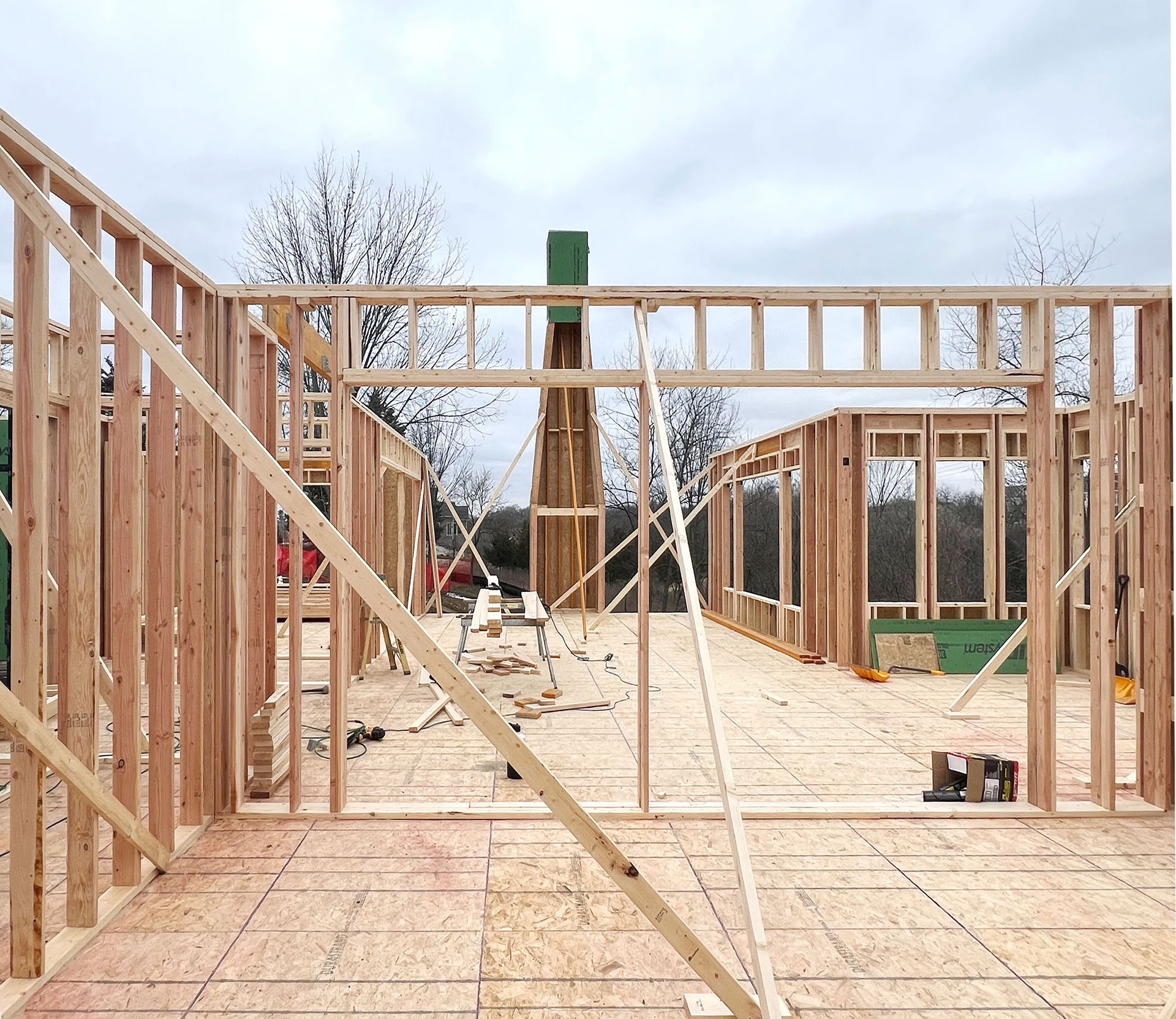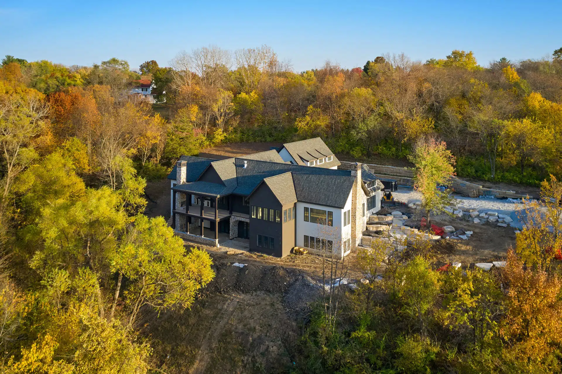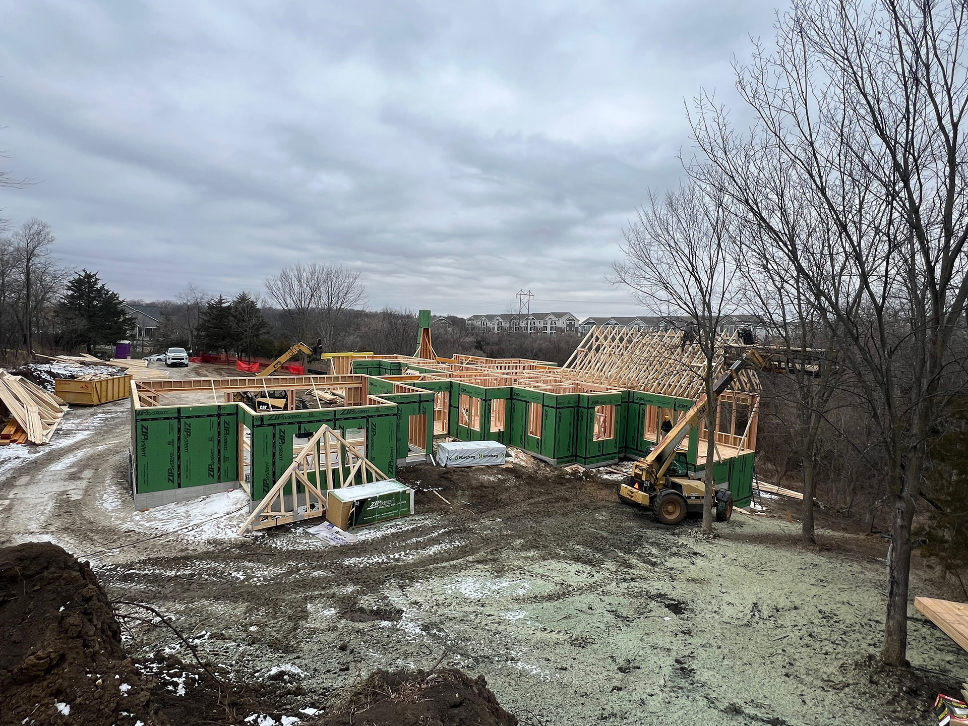 Construction is under way on this new house nestled into the trees of the rugged Iowa hillside.