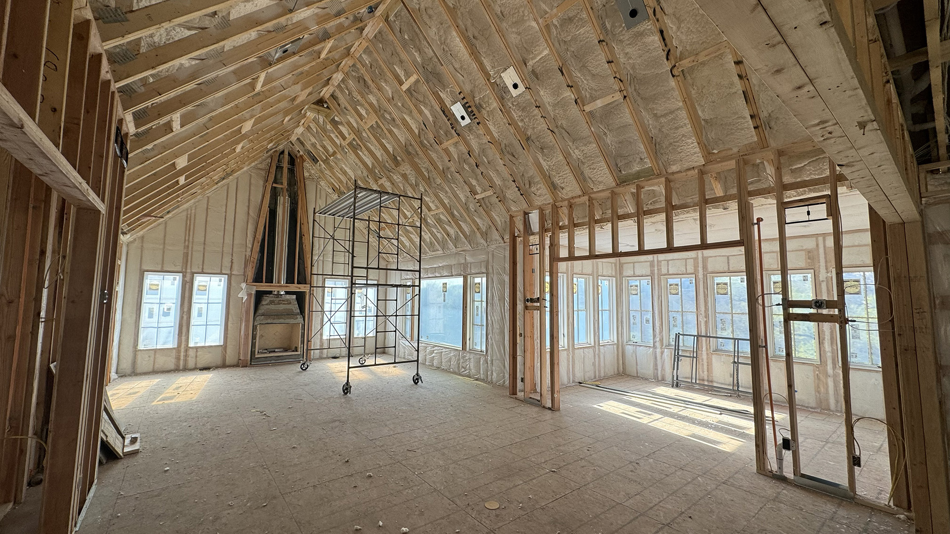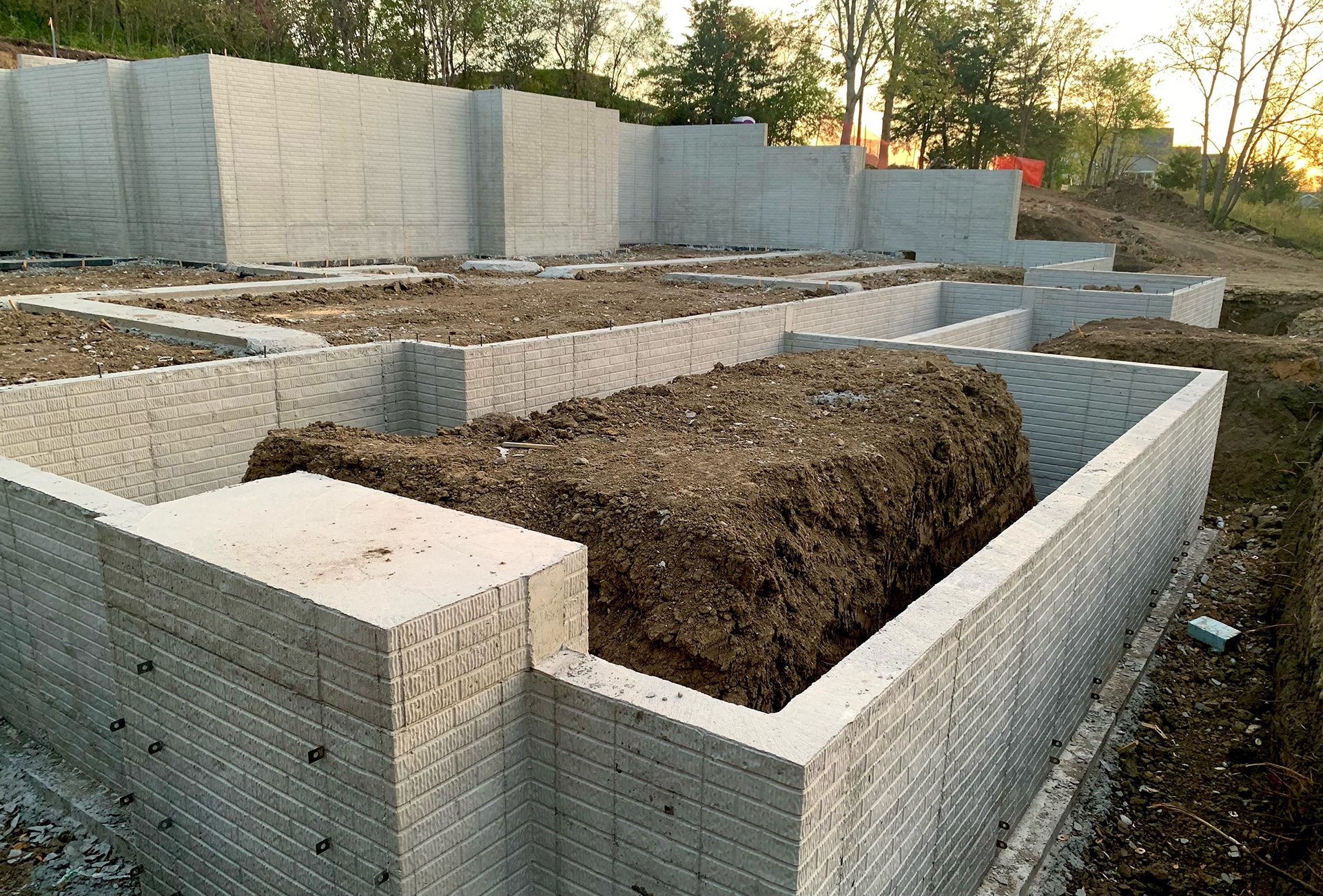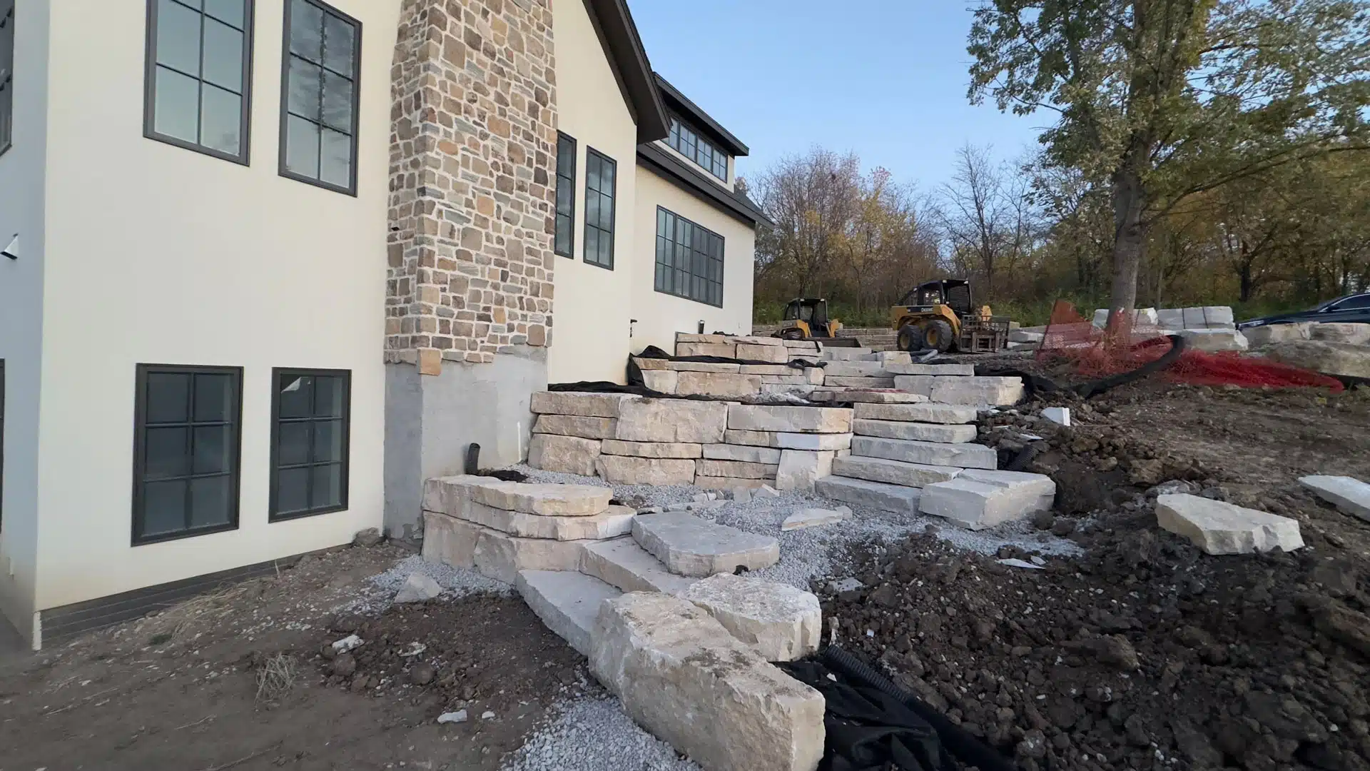 Construction is under way on this new house nestled into the trees of the rugged Iowa hillside.