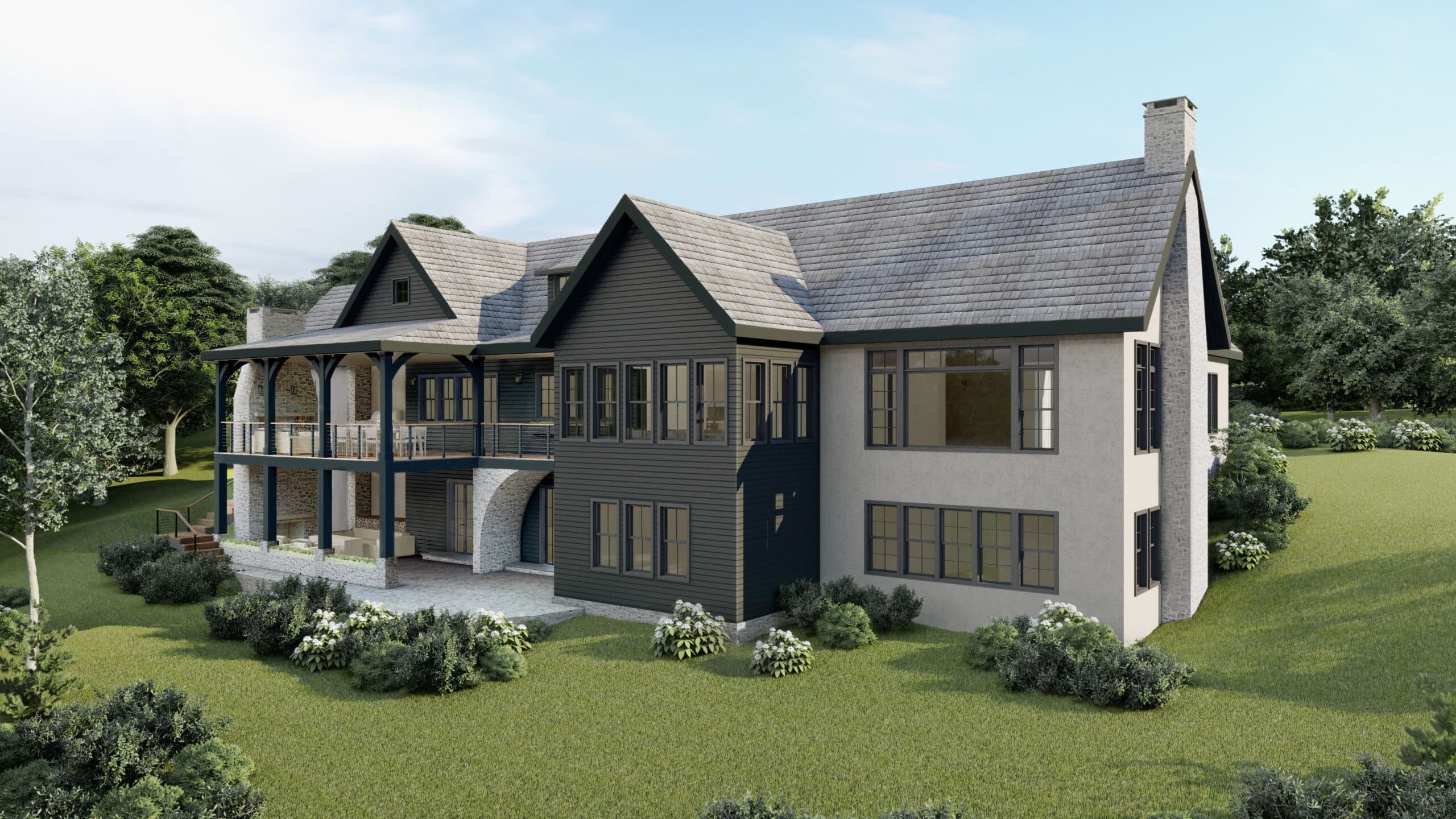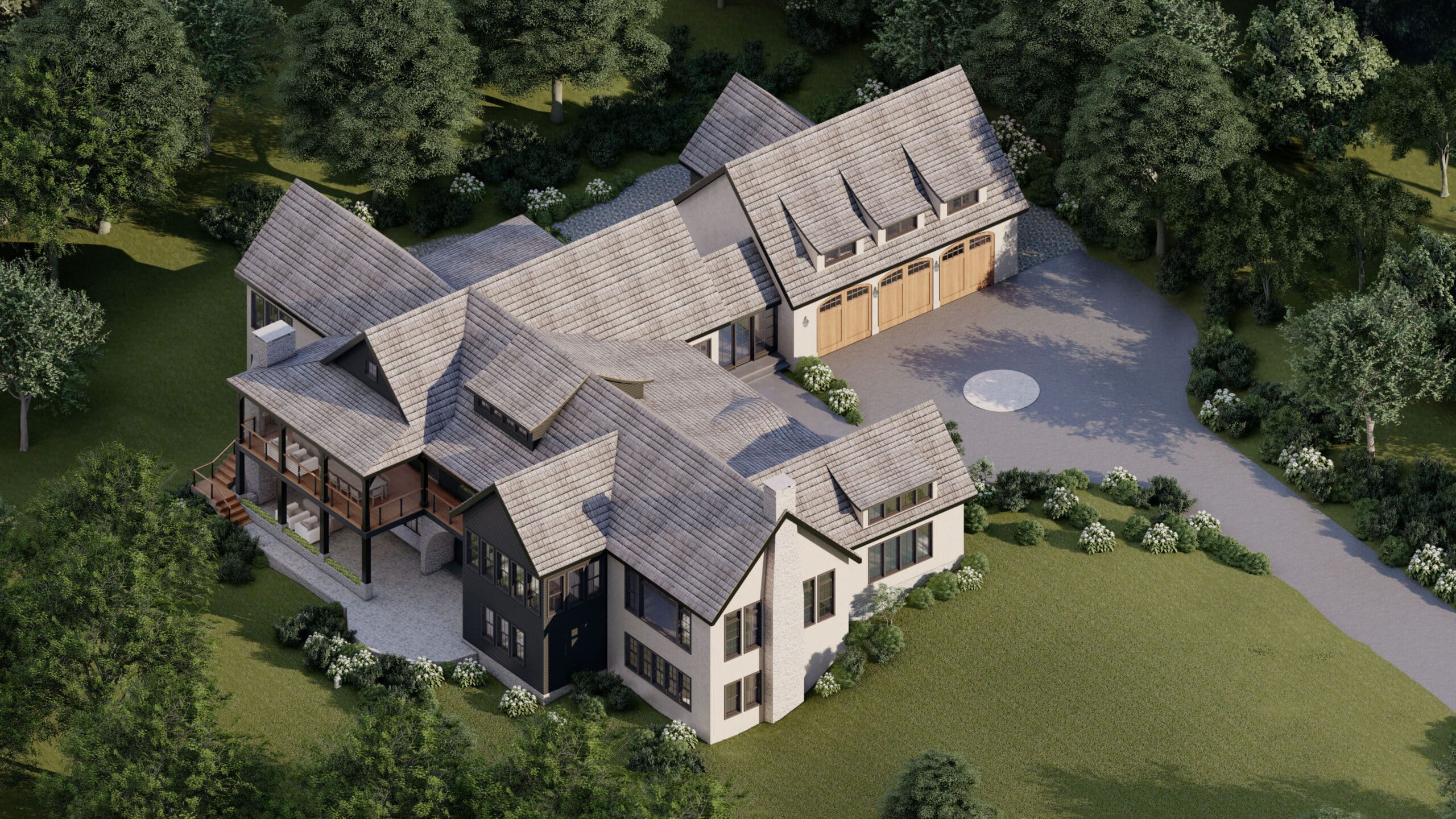 The house will be two stories: a main level on grade with the driveway, and a lower walk-out level with full height windows and access to terraced lawns, gardens, and patios. On the main level, the great room, library, dining and kitchen are positioned to receive the greatest natural light and views over the existing pond and between the existing tree line. The back entry, primary and guest suites are located on the wooded side of the house for added privacy.