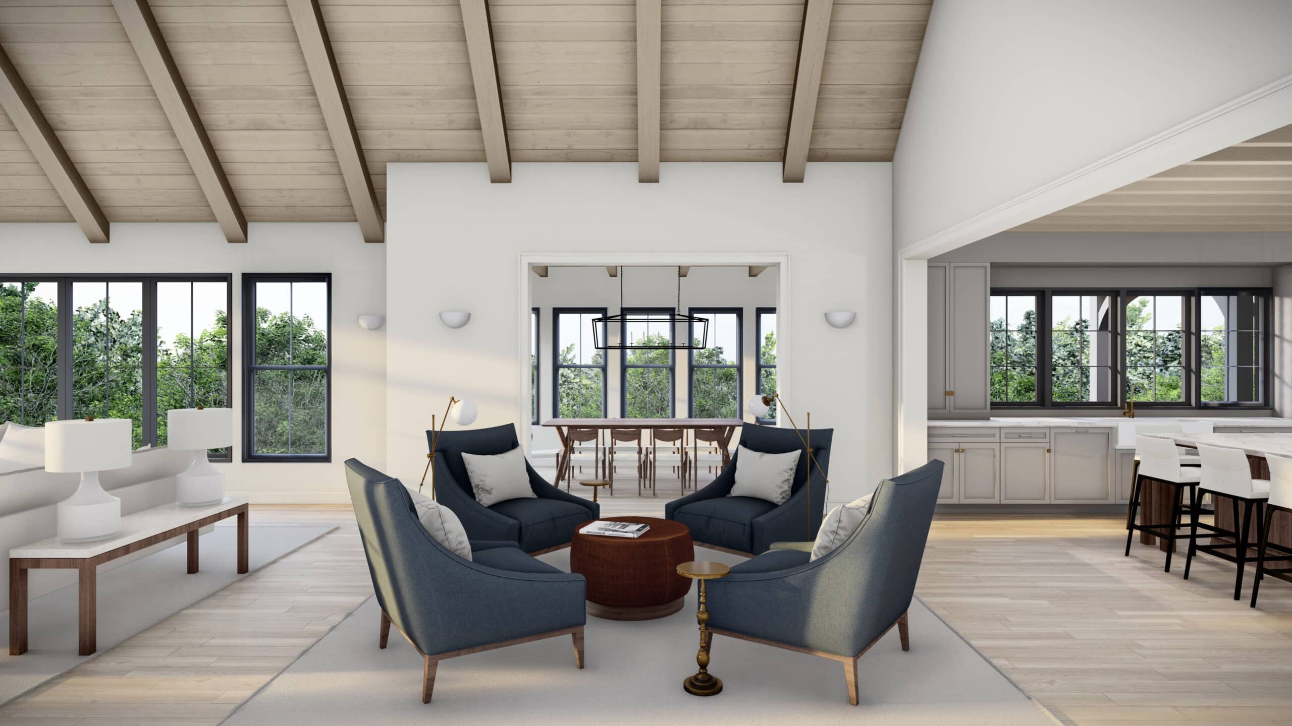 All spaces will be unified by a refined palette of natural materials, including rift sawn white oak, creamy honed marble and plastered walls. Bronze-colored windows, doors and siding contrast with the predominantly light stucco and limestone façade and mixed metal details carry throughout the interior and exterior. The result is a cohesive design anchored to the unique qualities of the site and imbued with timeless elegance.