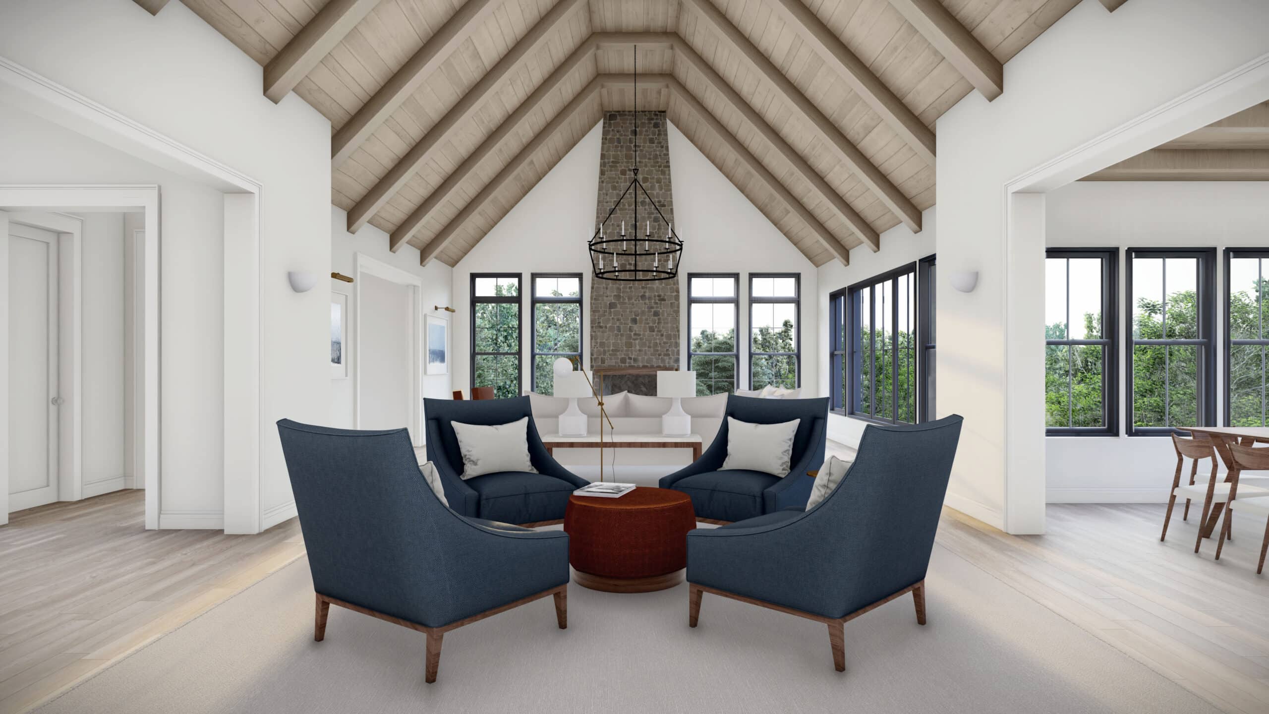 In 2018, a family of five purchased a 7-acre wooded lot on the outskirts of Des Moines with a dream to build a home-base for extended family. Enamored by the sunsets over the pond, the variety of flora, and the abundance of wildlife, they became certain that they wanted to preserve much of the lot for hiking trails and animal habitat, and to create a home that took advantage of the existing topography and views.