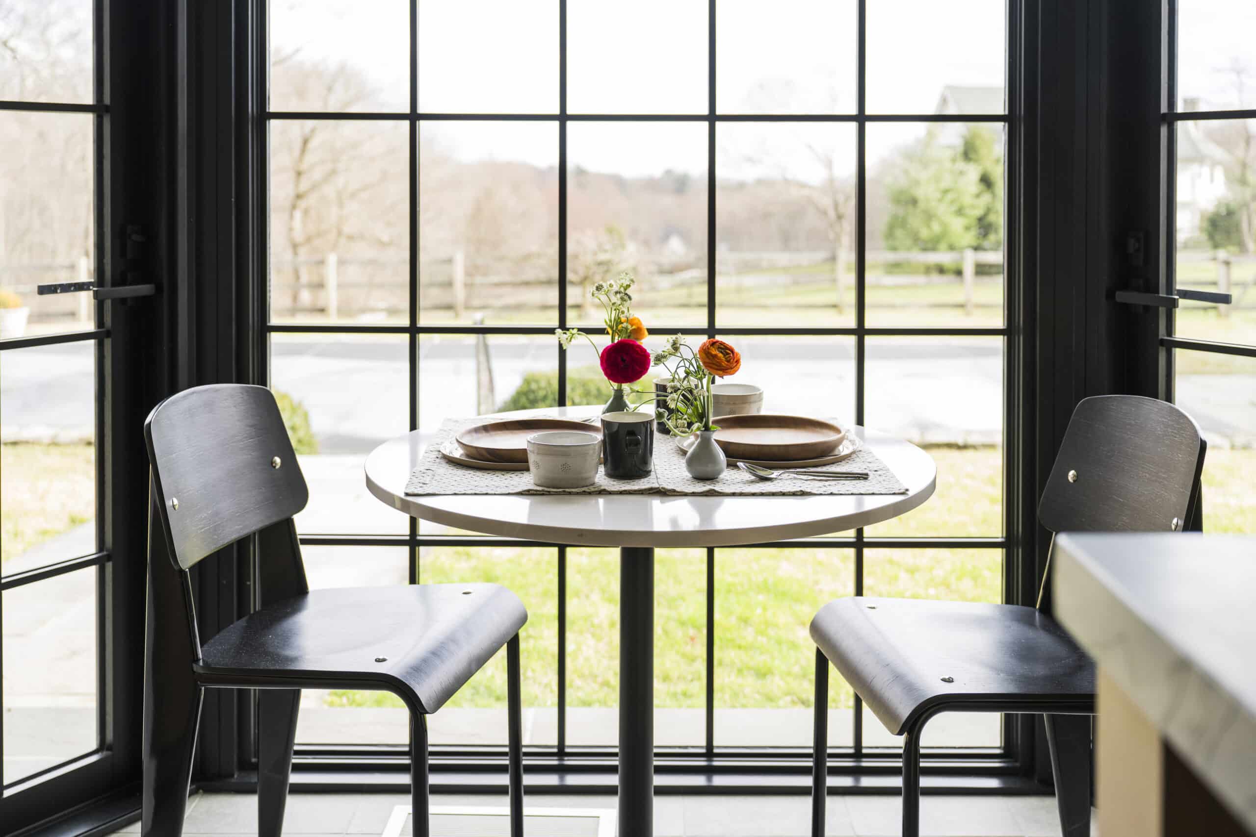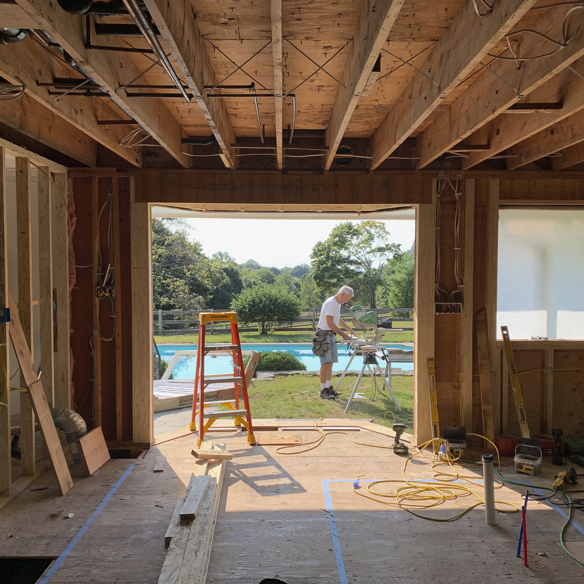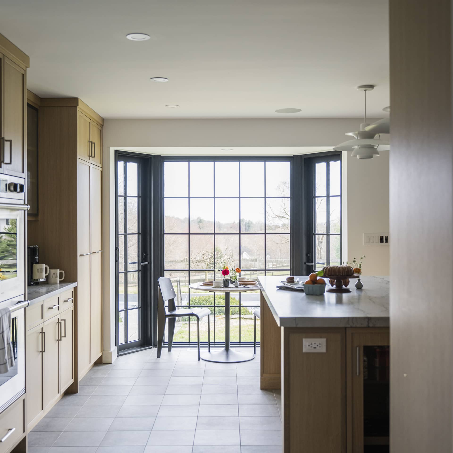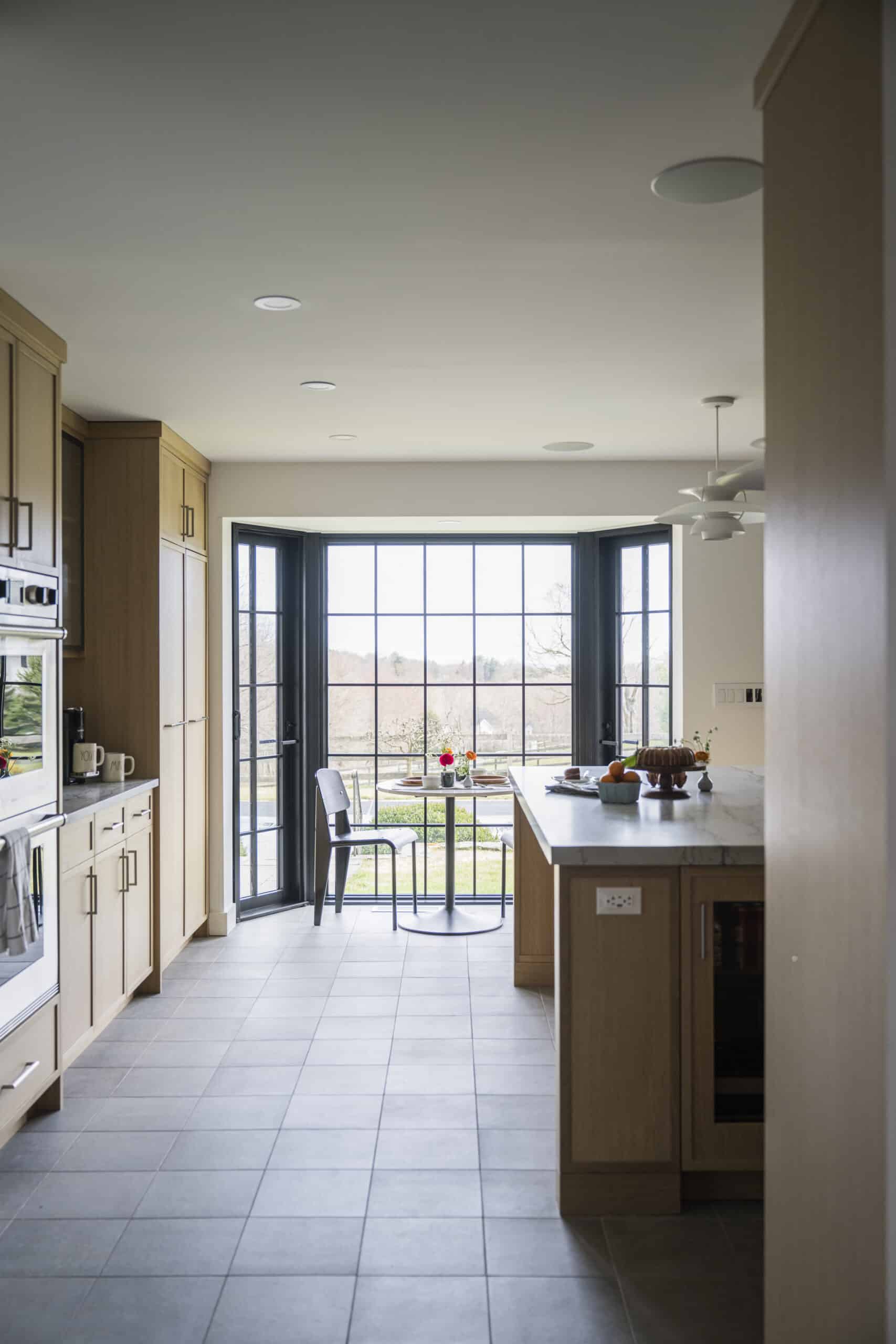 The existing orientation and layout of this house responds extremely well to the conditions of this pastoral property. The floor plan forms an “L” around a long south-facing pool. On the ground floor, the living room, kitchen, and guest room all face the pool with views to the open field beyond. Each of these spaces accesses the pool through glass doors flanking large full height windows. Off the long side and along the east side of the pool is a screened porch kept cool by the hillside breeze. The existing ground floor living area was already open and spacious, ideal for entertaining large groups of friends and family. However, for a couple who also love to cook and gather, the kitchen was too small and dated to be functional for their needs. Moreover, with plans to start a family, they needed a kitchen that was elevated in finish, but also functional and comfortable for all ages.