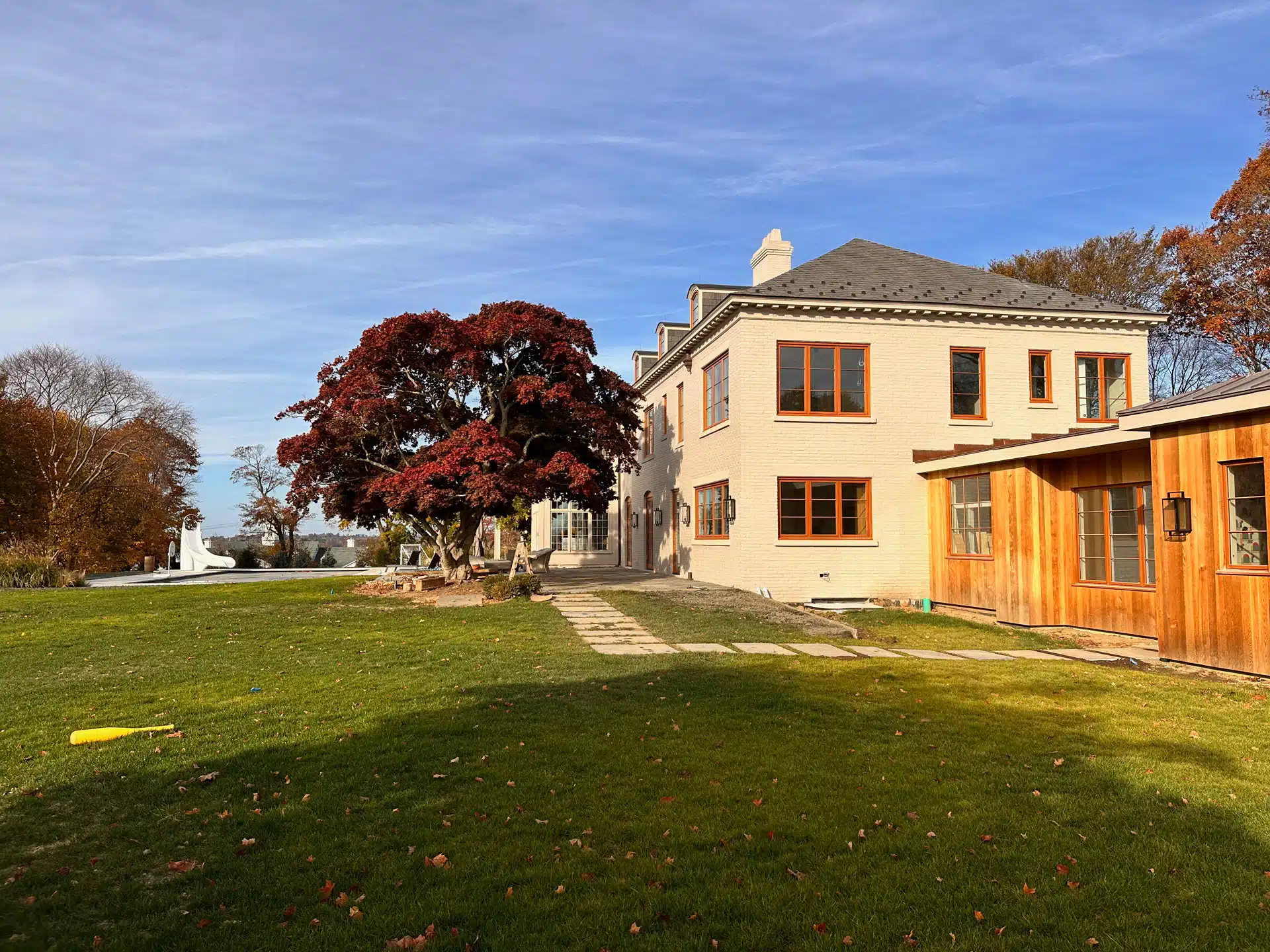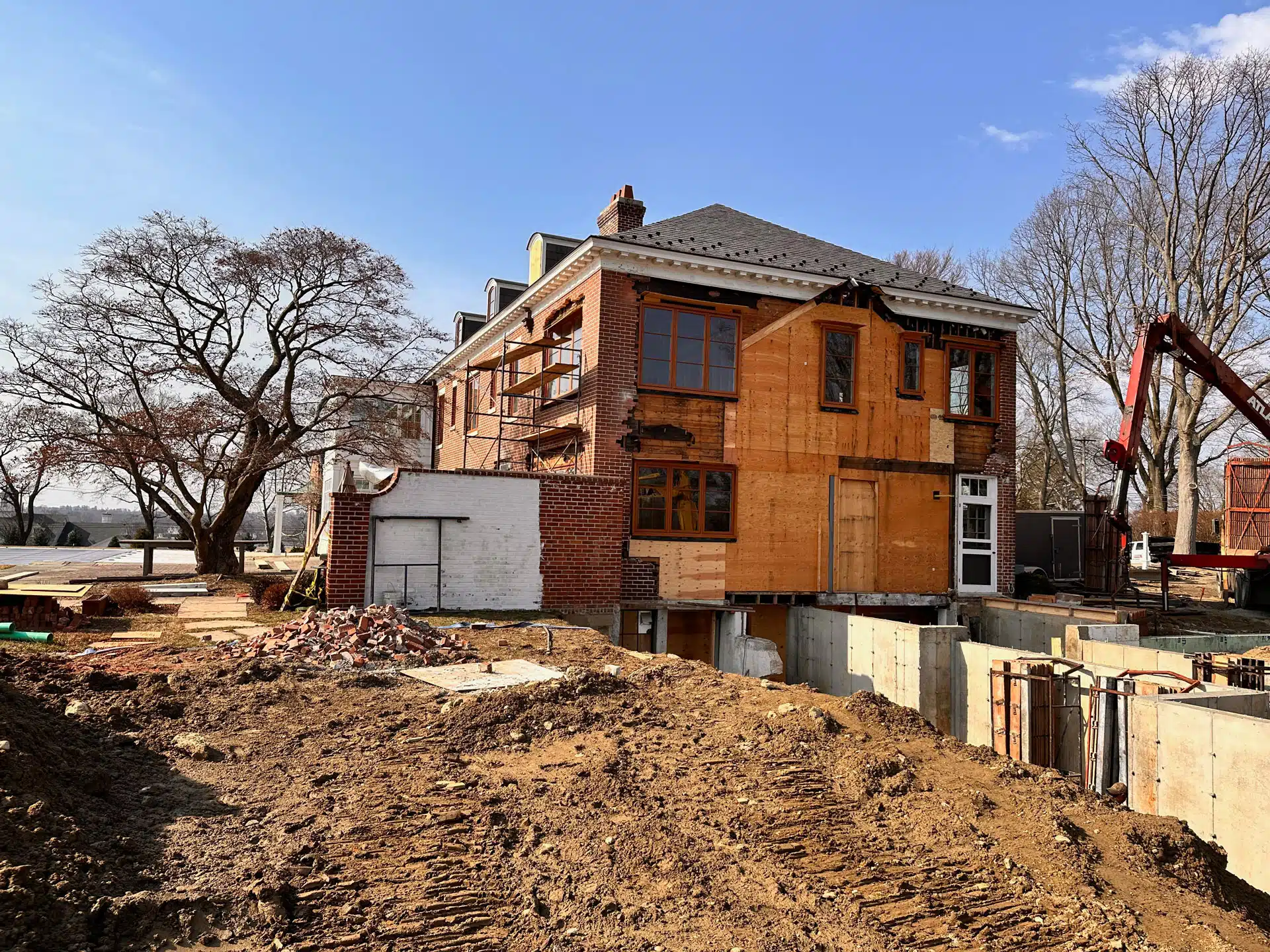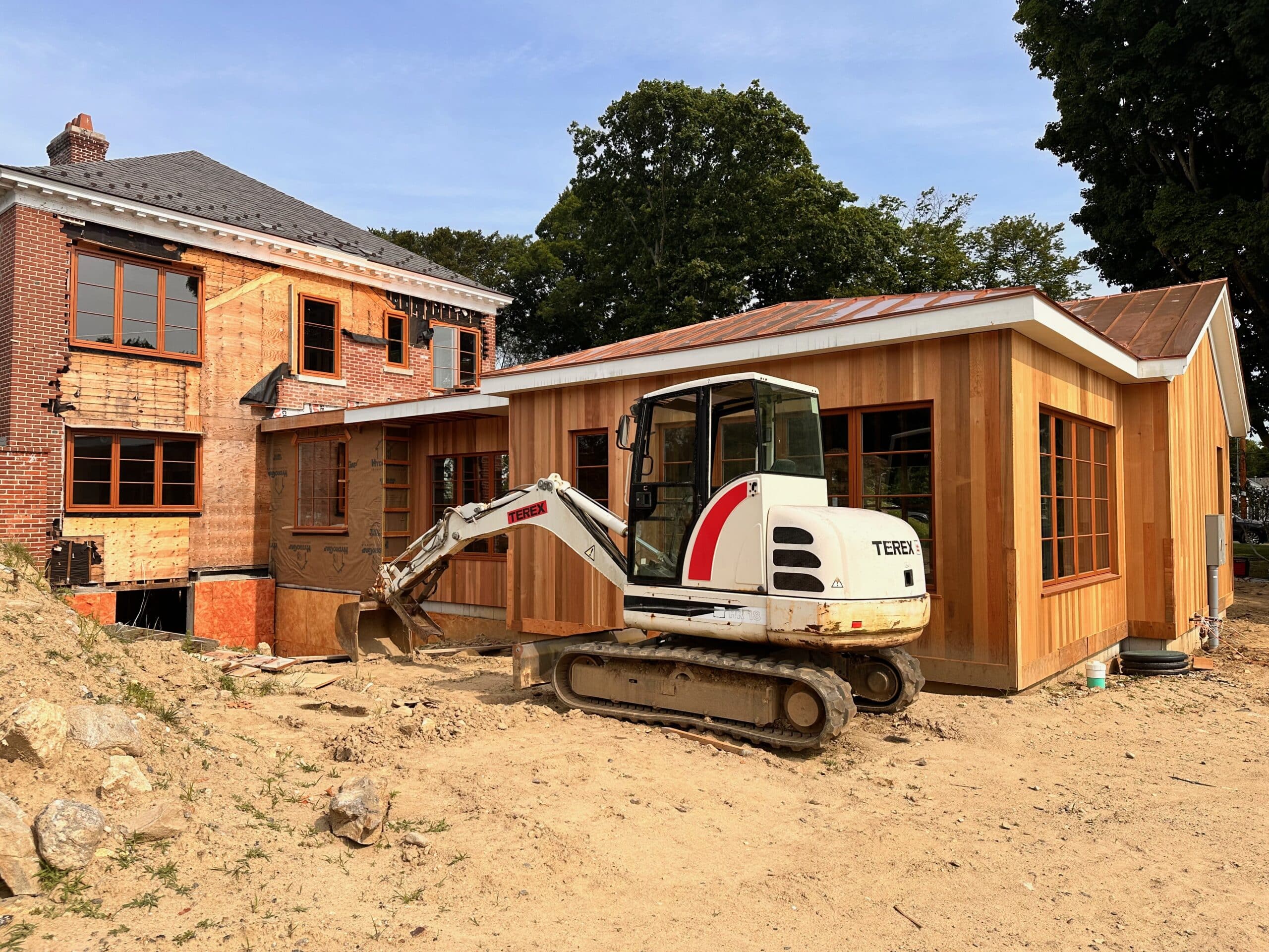 Inside on the first floor, we updated the entry hall and powder room, repositioned and enlarged the kitchen and pantry, and improved the general flow between common spaces. The new addition connects to the previously unfinished basement via an internal stair. The newly renovated basement will have a family media room, places for the kids to play, and much needed storage space including a conditioned wine cellar. The effort required to finish the basement was hefty, including new systems for heating and cooling, and the addition of a French drain system and sump pumps to keep the basement dry.